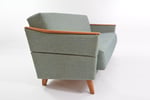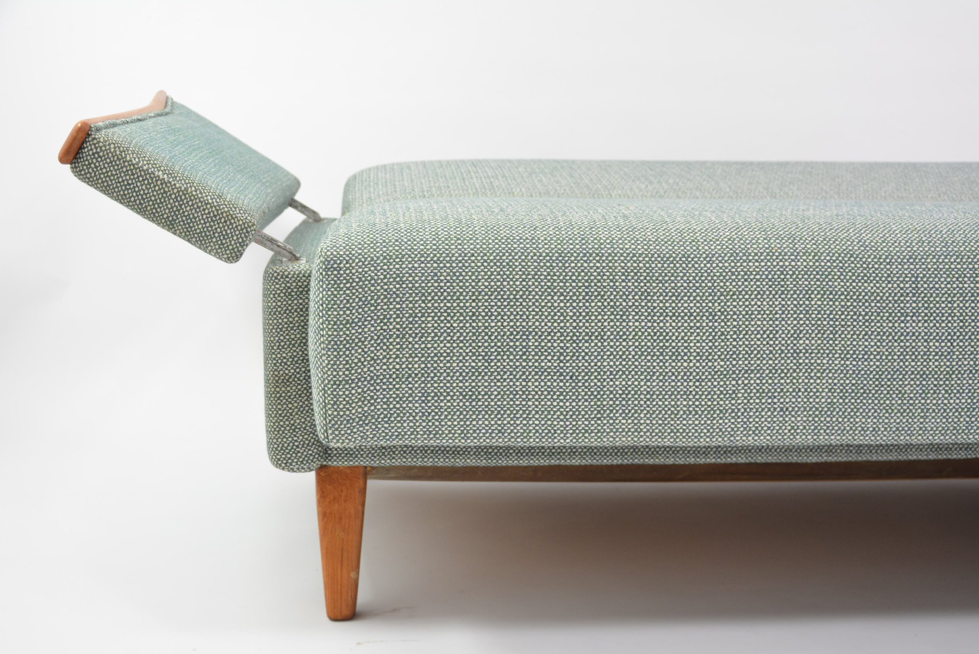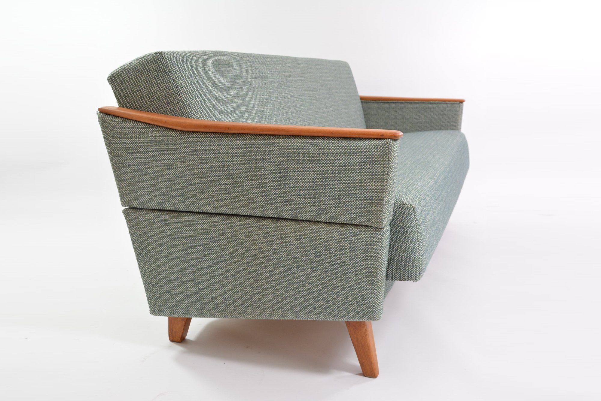 Rénovation intégrale : bois, garniture - ferme et idéal pour le couchage- tissu bleu/vert/crème chiné gros. Accoudoirs mobiles se déplient en 2 positions vers l'extérieur.