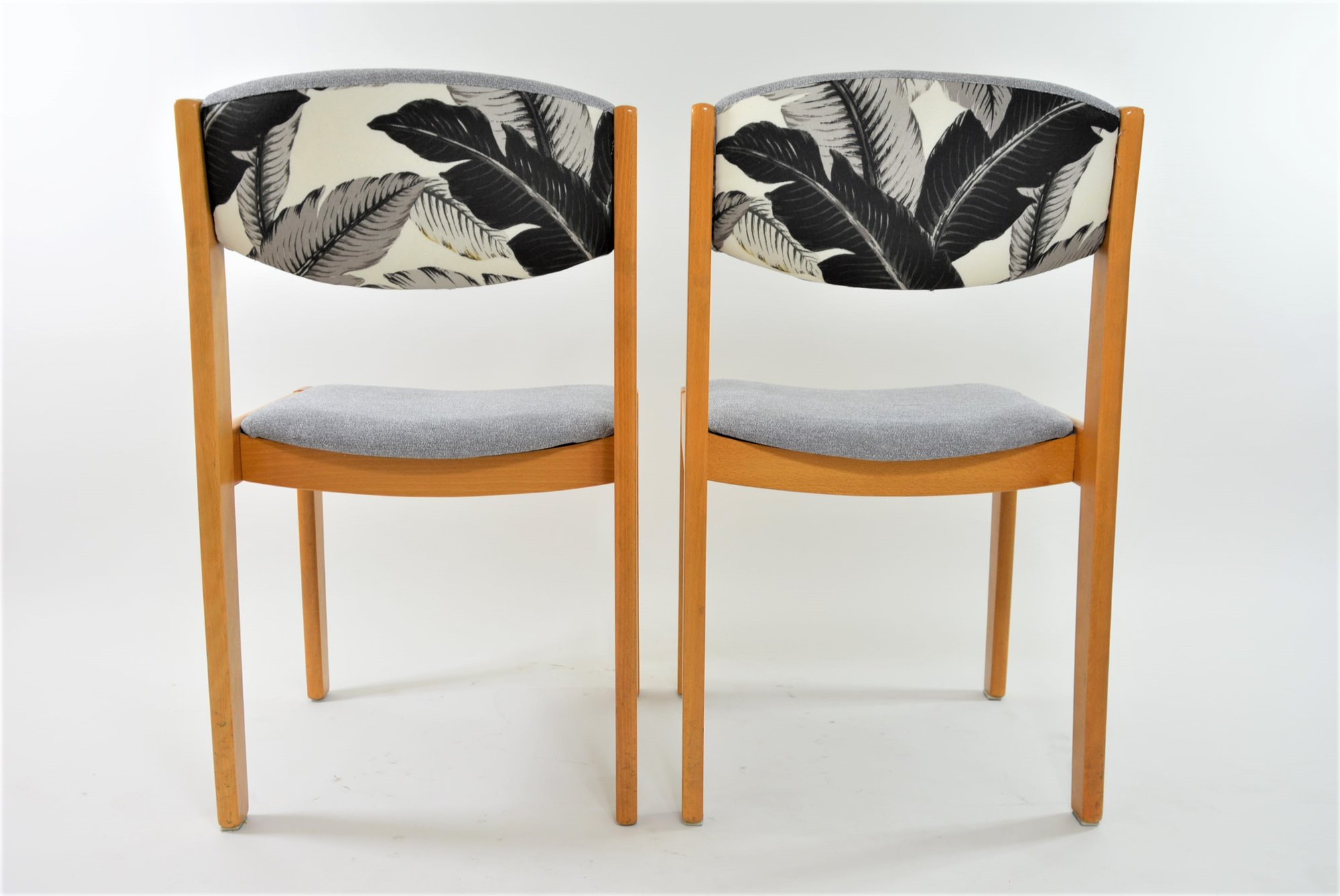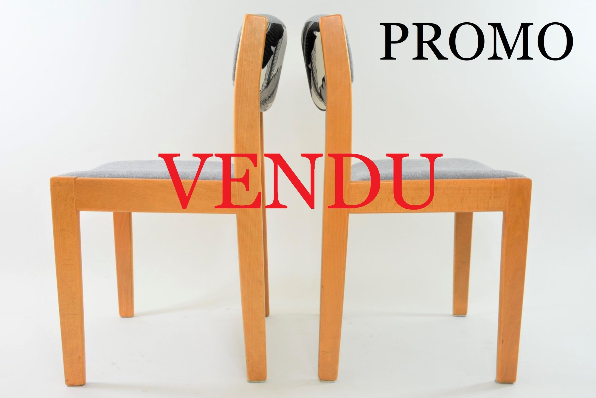 Quatre chaises en chêne clair restaurés en tissu gris antitache.