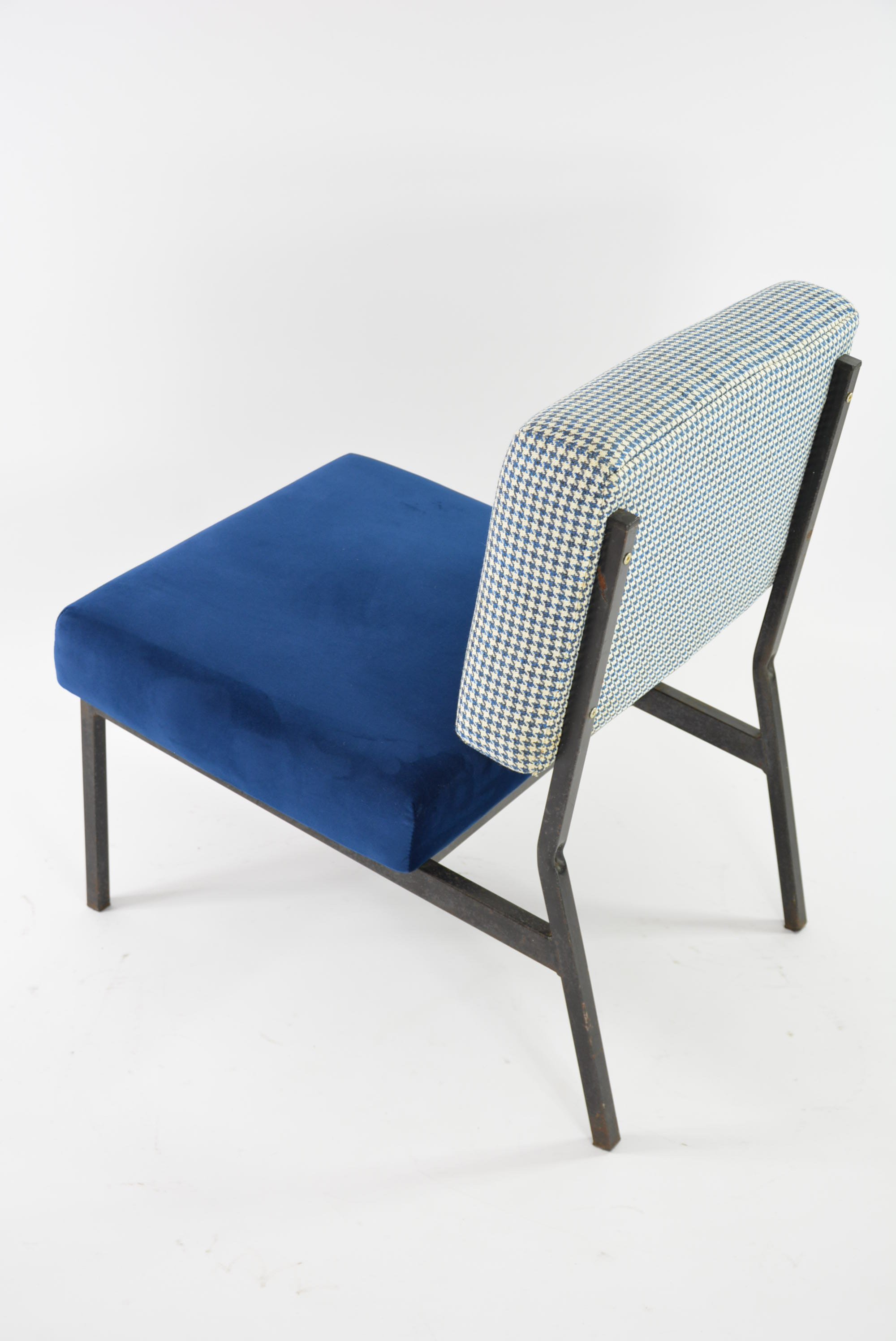Fauteuil classique années 70 à dossier et assise séparés, montés sur la structure en métal noir. Design léger et subtile.