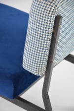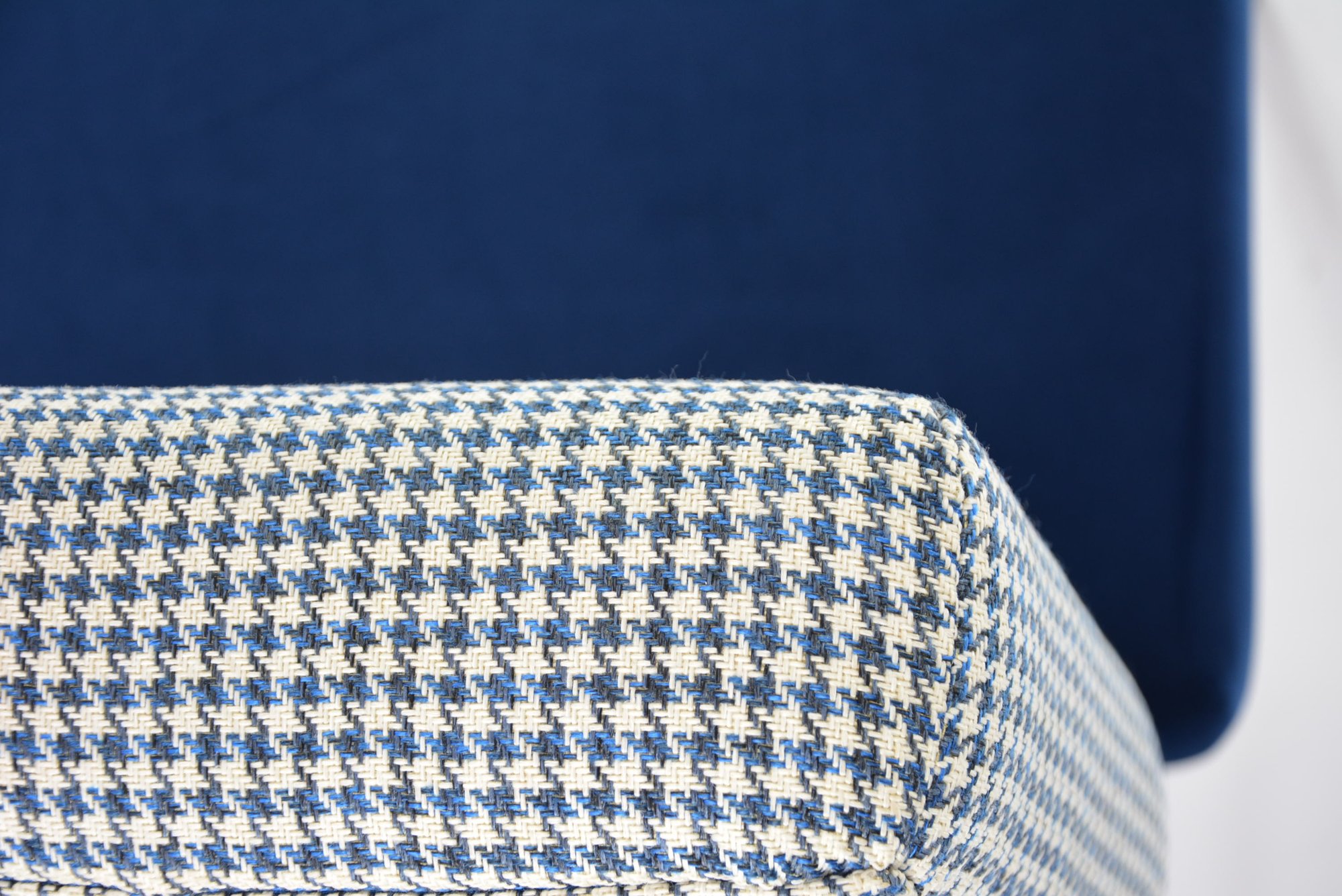 Fauteuil entièrement restauré: garniture, ceintures, mix tissus avec le velours antitache bleu nuit et le tissu chiné pieds de poule bleu posé sur le dossier.