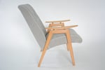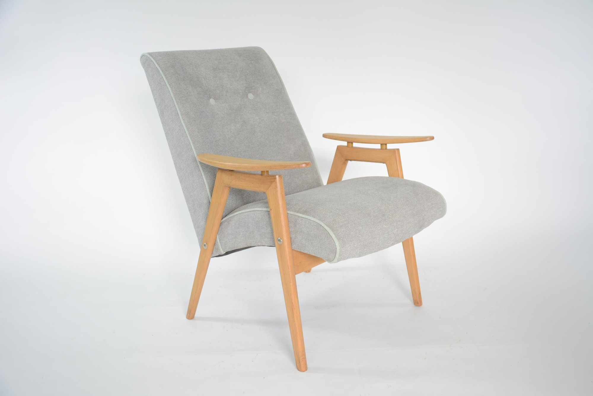 Entièrement restaurés. Tissus agréable et épais, antitache de couleur gris. Passe poil et boutons en tissu mint clair de la même collection .Beau vernis chene clair / aspect ciré satin/ avec la structure de bois poncée et revernie.