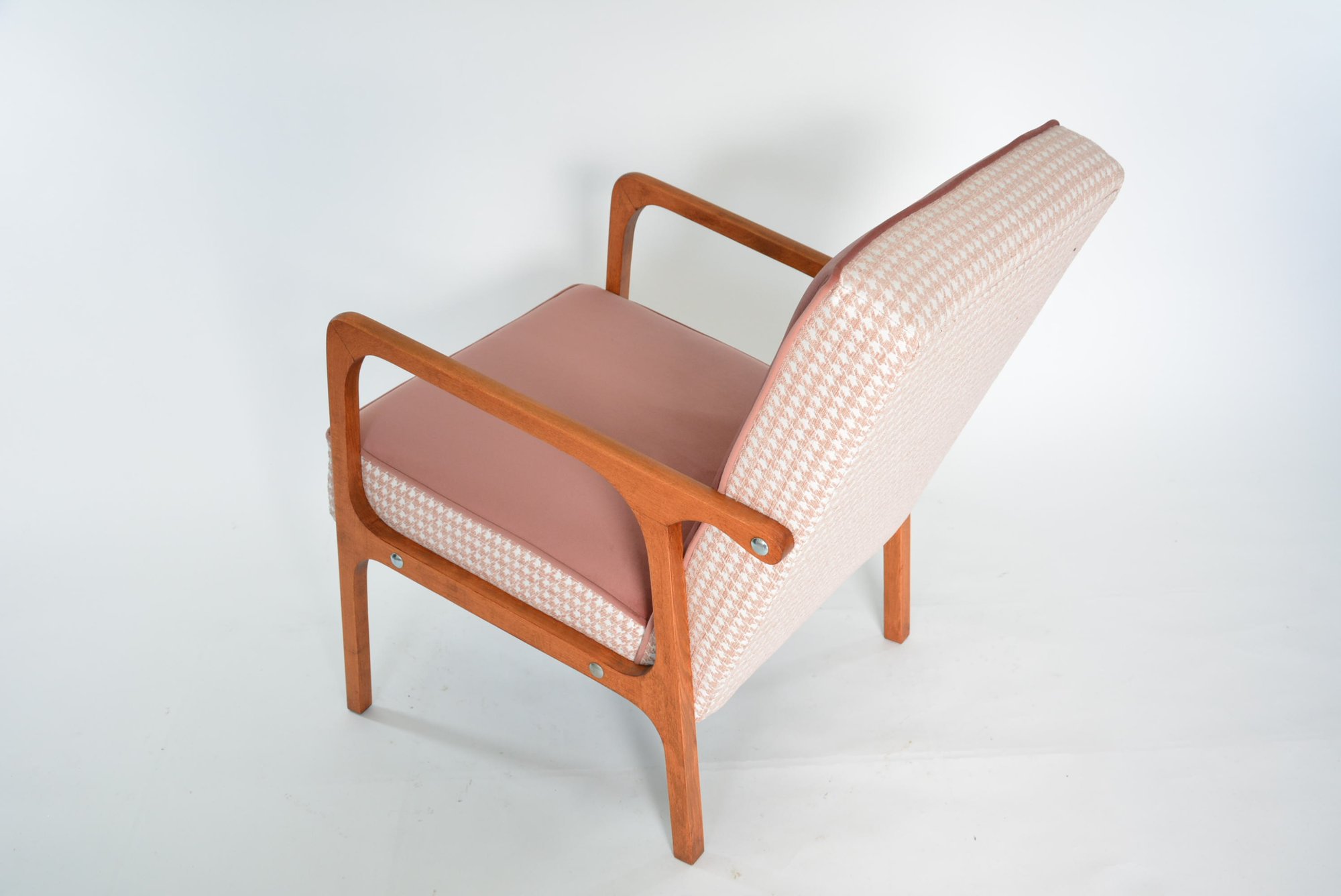 Restauration intégrale des partis bois et de l'assise recouverte d'un magnifique tissu velours antitache rose et d'un tissu à motif pieds de poule.