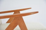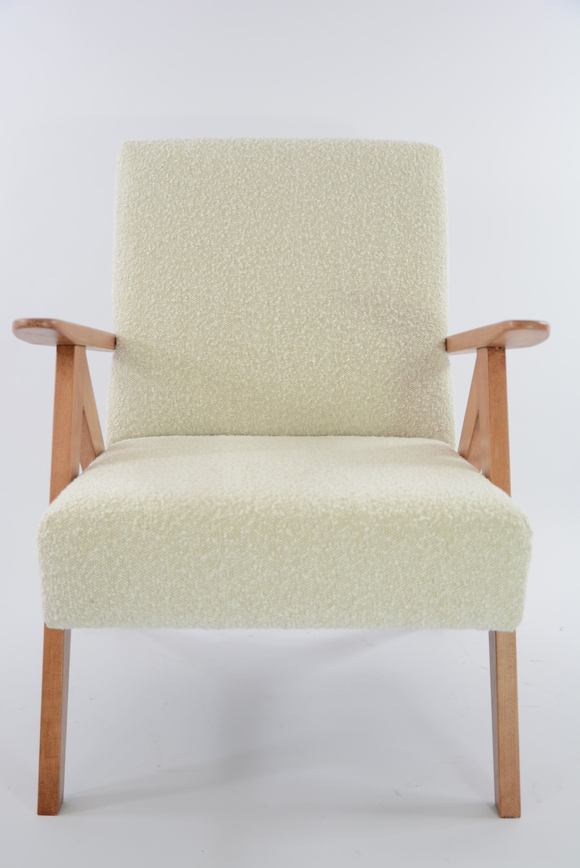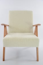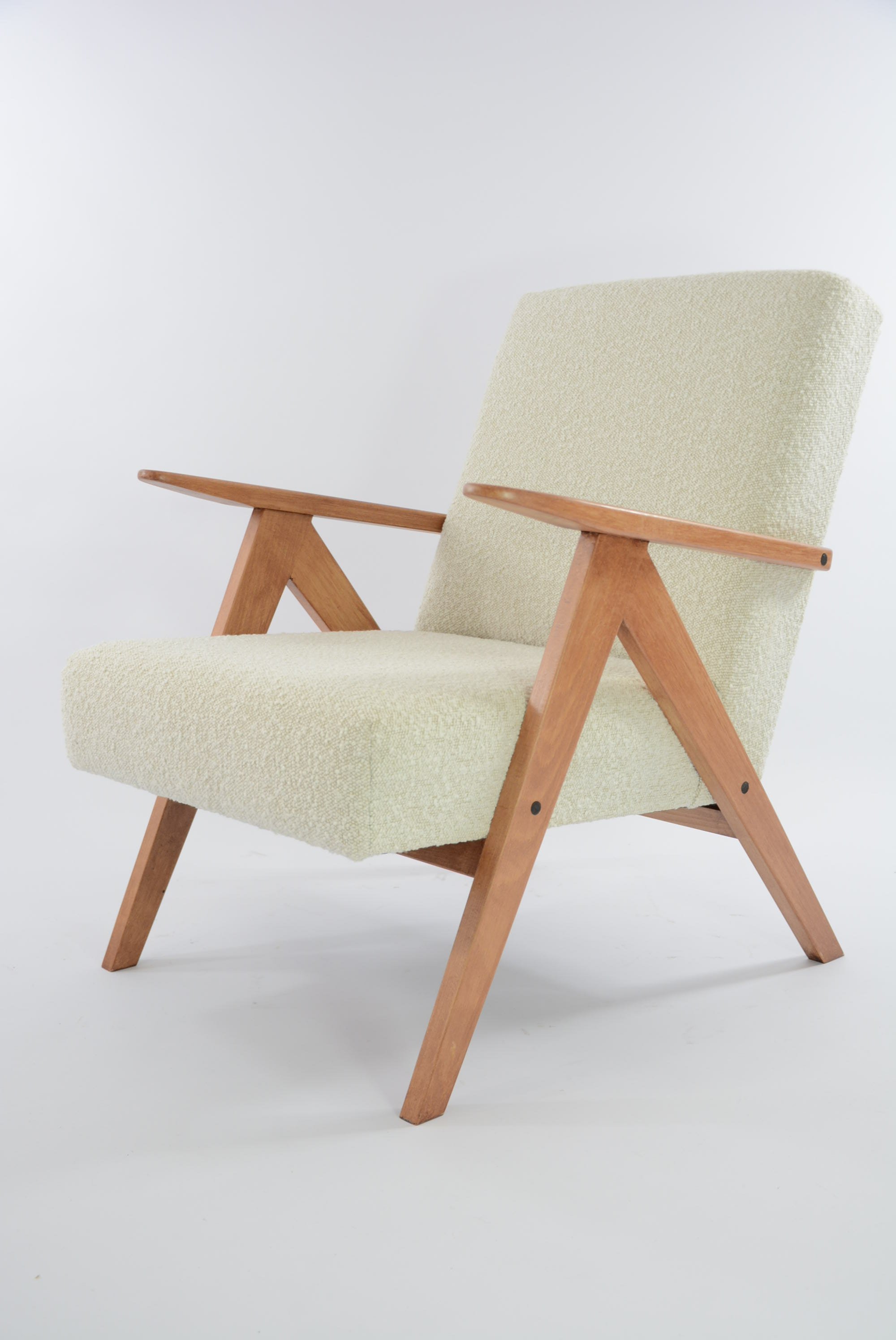 Rénovation intégrale comme pour toutes nos pièces: garniture, bois, tissu - bouclette synthétique lavable ivoire . Bois de couleur teck.