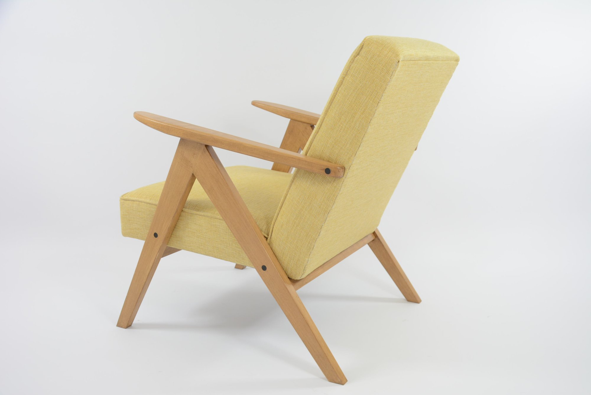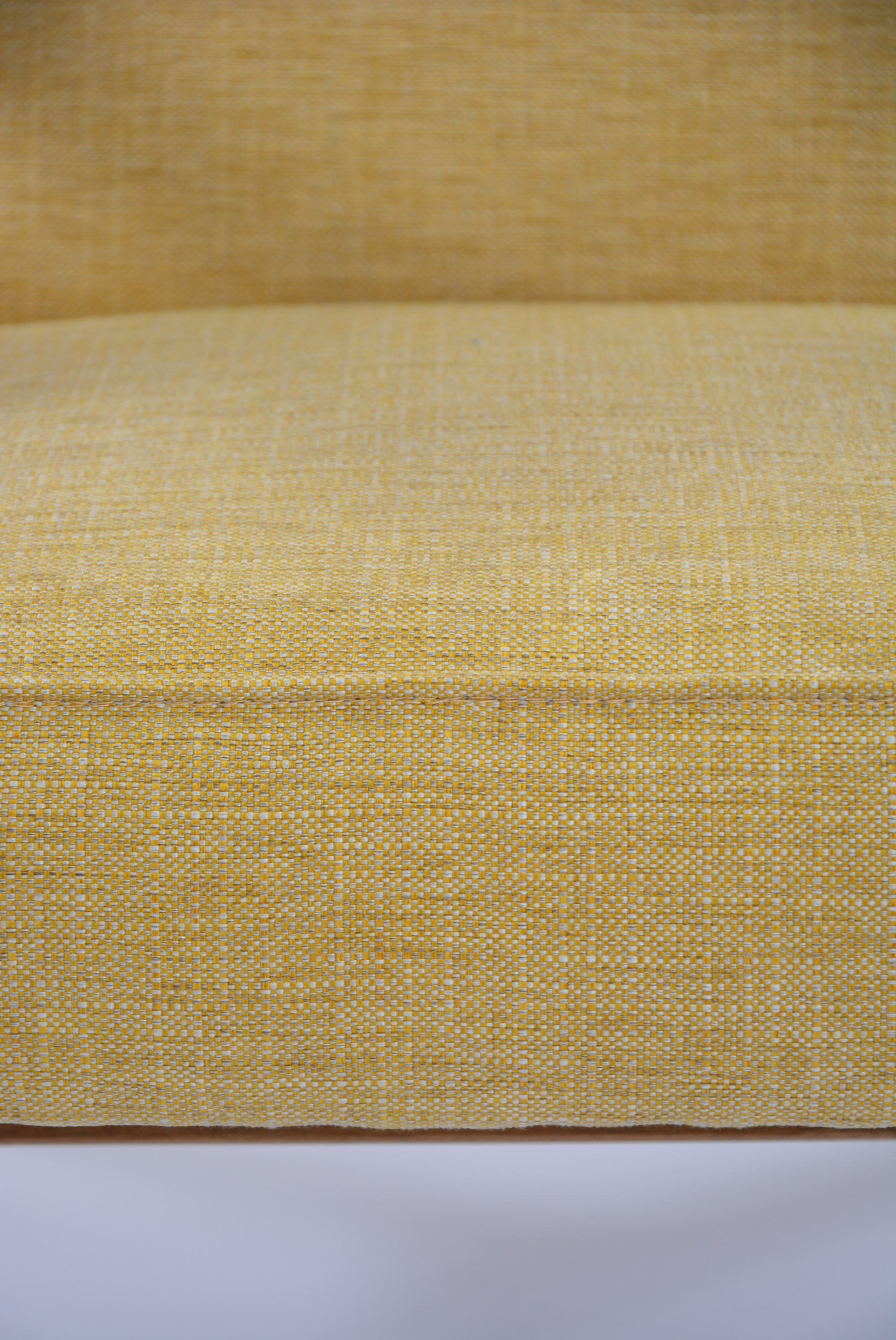 Rénovation intégrale comme pour toutes nos pièces: garniture, bois - vernis teck brun. Tissu jaune antitache chiné antitache. Finition avec le passe poil.