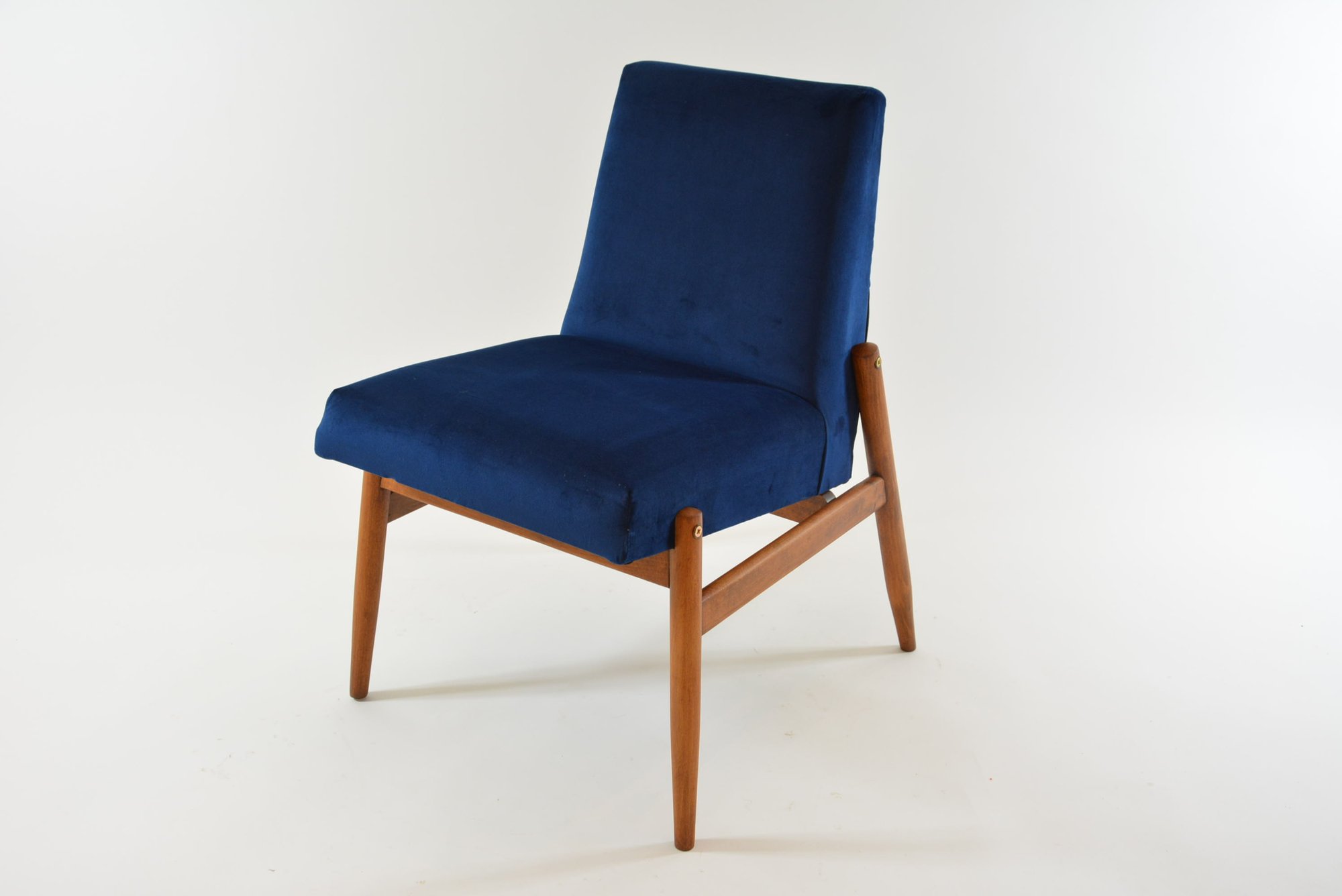 Petits fauteuils des années 60 sans accoudoirs. Construction épurée et fonctionnelle. Modèle idéal pour un petit espace. Entièrement restauré en tissu velours bleu nuit avec le derrière du dossier tapissé en demi rond avec le tissu velours gris et les cutures.