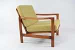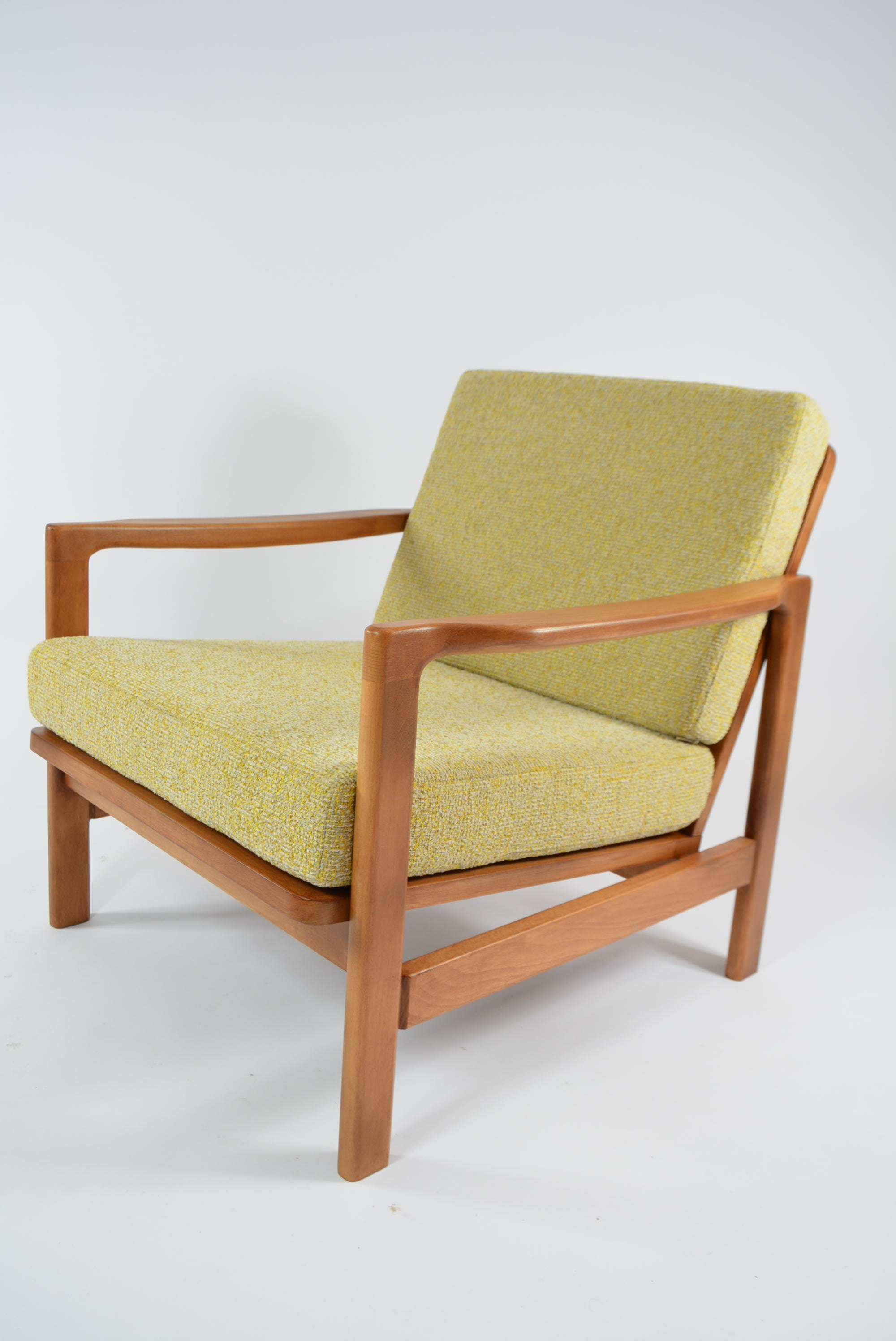Entièrement restauré: changement intégral des coussins, des ceintures et du bois - couleur Teck. Tissu antitache chiné gros jaune.