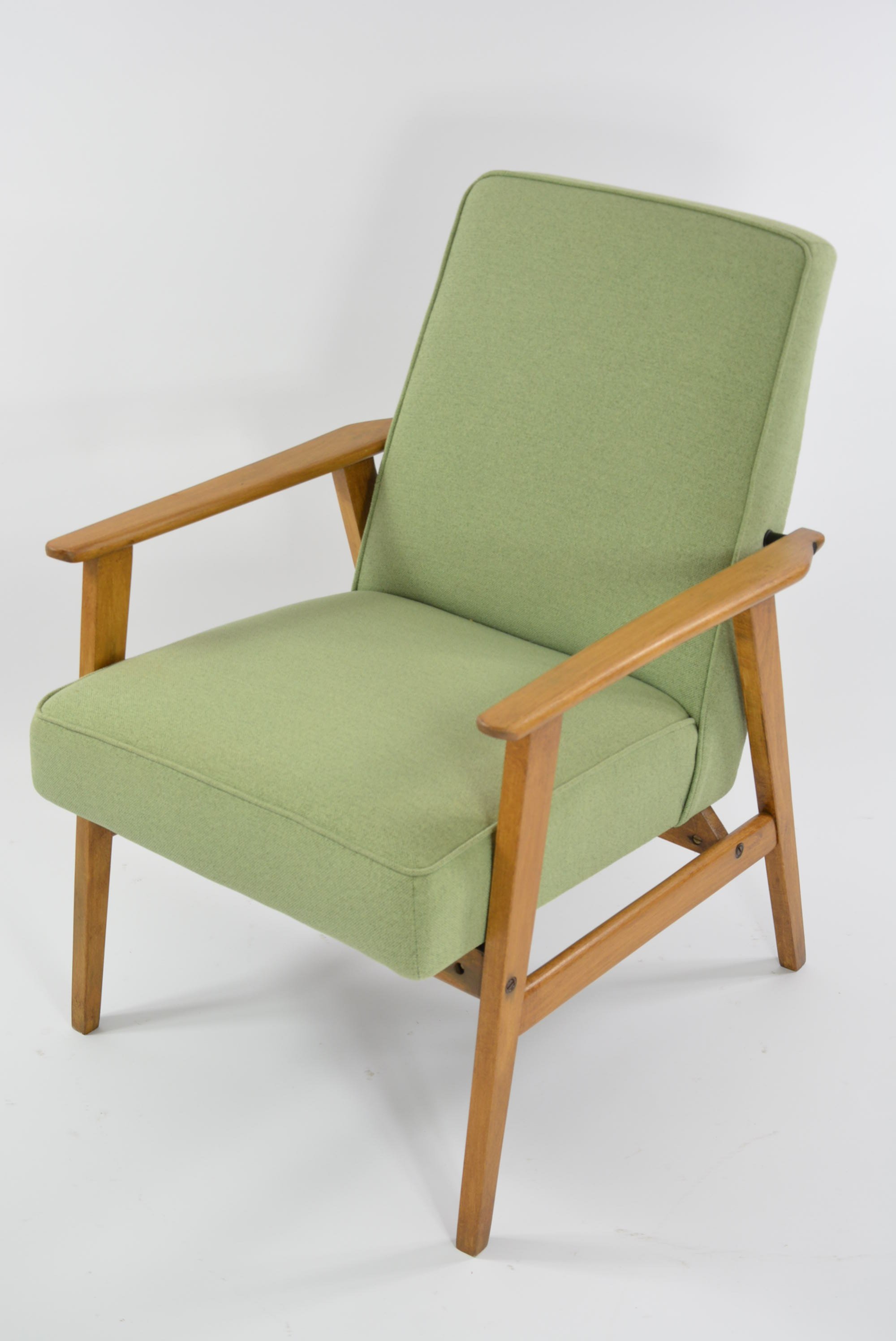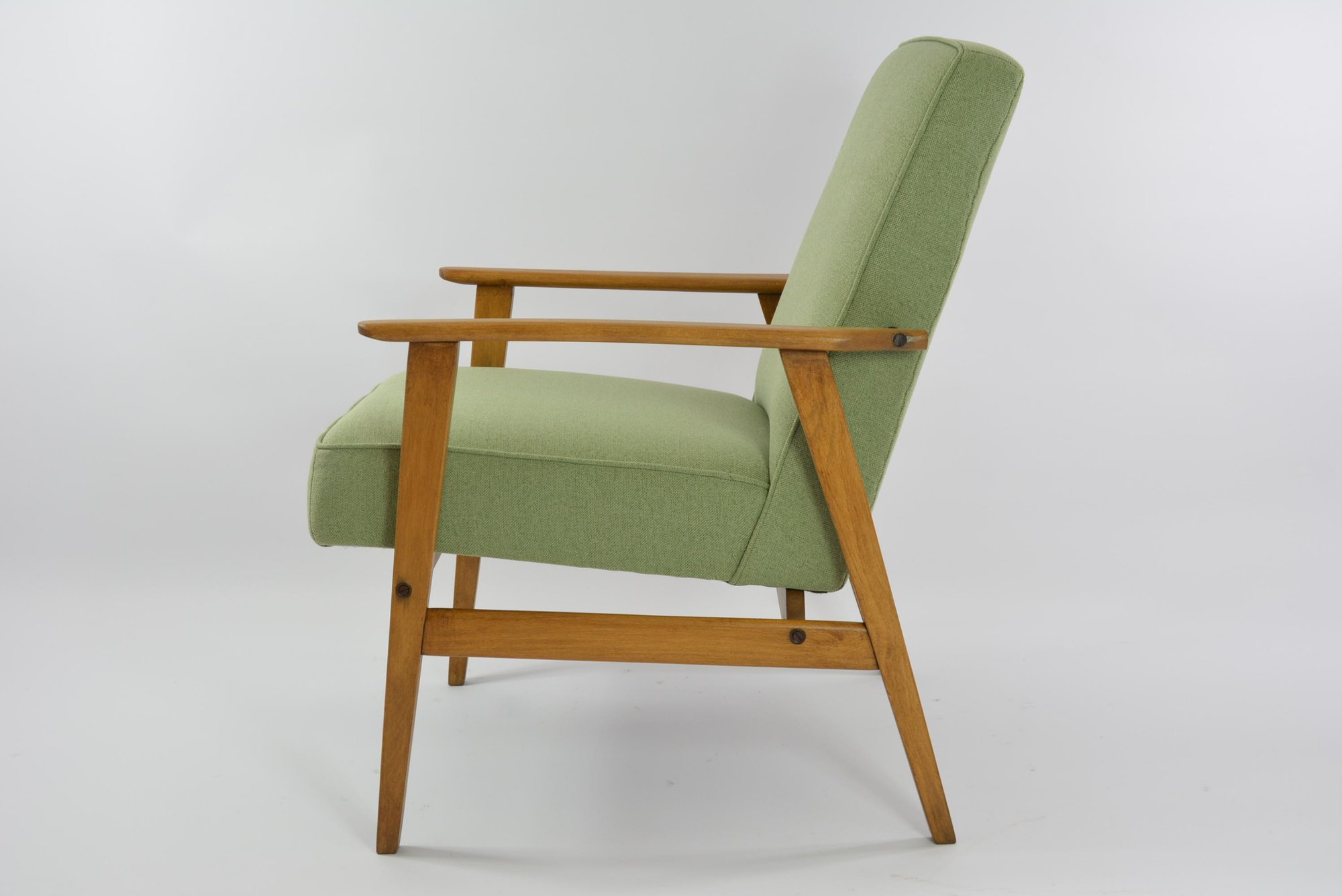 Entièrement restauré. Tissu antitache vert frais clair avec le passe poil autour de l'assise. Beau vernis teck brun/ aspect ciré satin/ avec la structure de bois poncée et revernie.