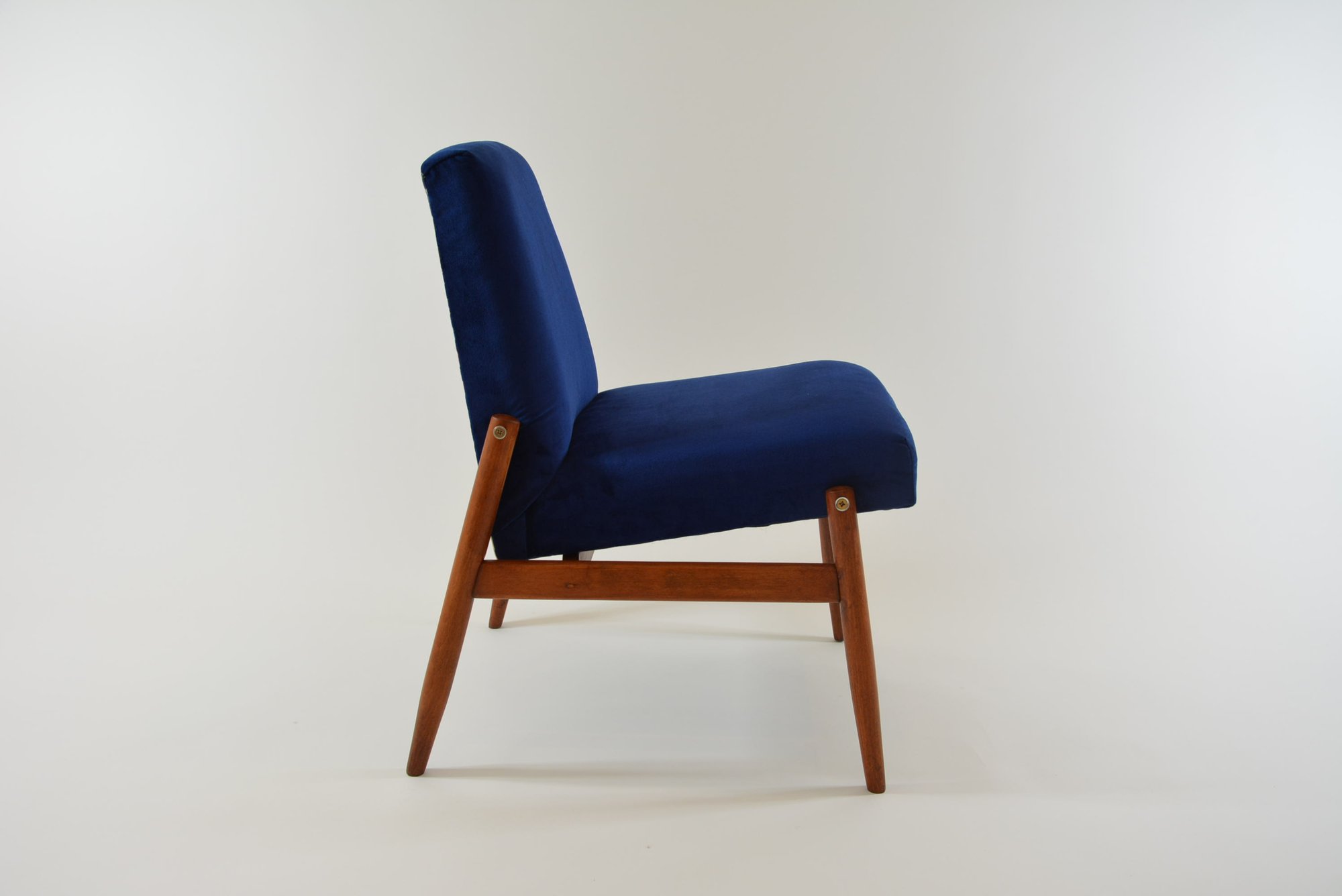 Petit fauteuil des années 60 sans accoudoirs. Construction épurée et fonctionnelle. Modèle idéal pour un petit espace. Entièrement restauré en tissu velours bleu nuit avec le derrière du dossier recouvert d'un tissu exclusif à motifs (Jardin japonais).