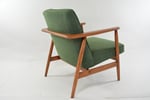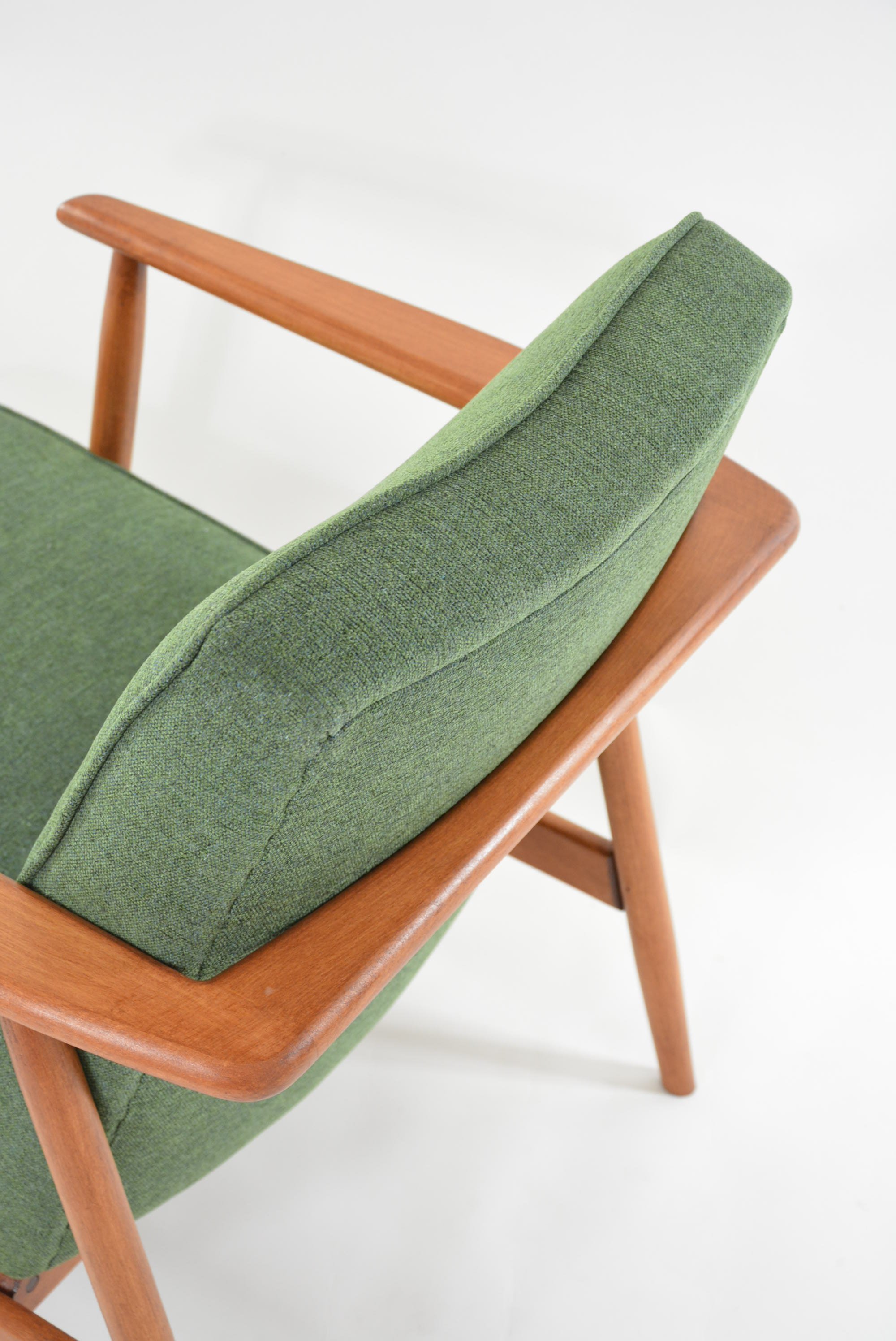 Réfection totale de la structure bois (ponçage, vernis neuf) et de l'assise (garniture, sangles neufs). Tissu chiné vert (antitache) avec le passe poil autour de l'assise.